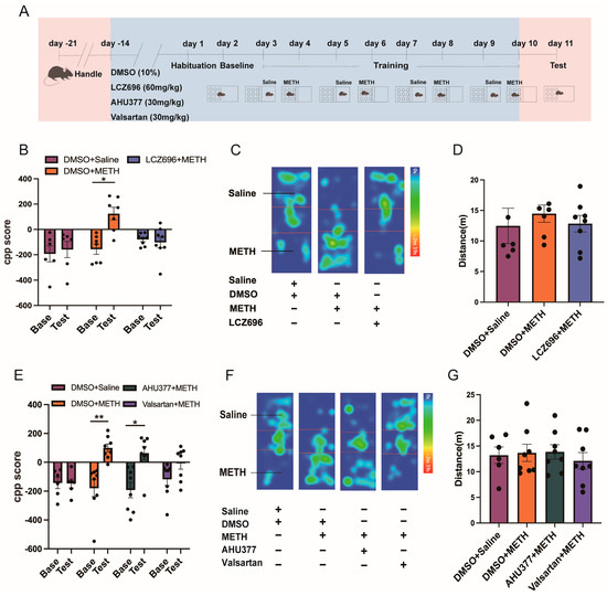 The effect of LCZ696, AHU337, and valsartan on METH-associated contextual memory acquisition. (A) The experimental timeline. (B) LCZ696 decreased CPP score in mice exposed to METH. (C) Heat map of the mice’s trajectory in the CPP apparatus. The color of the bar from 0 s to 2 m 19 s on the right side of the panel changes from blue to red, which represents the time the mouse spends in one area. (D) The locomotor distance of the spontaneous activity test in mice administered with LCZ696. (E) The effect of valsartan and AHU377 on CPP score in mice exposed to METH. (F) Heat map of the mice’s trajectory in the CPP apparatus. The color of the bar from 0 s to 2 m 19 s on the right side of the panel changes from blue to red, which represents the time the mouse spends in one area. (G) The locomotor distance of the spontaneous activity test in mice administered with AHU377 and valsartan. * p < 0.05, ** p < 0.01.