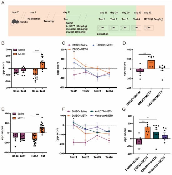 The effect of LCZ696, HUA377, and valsartan on METH-induced robust relapse in METH CPP acquisition mice. (A) The experimental timeline. (B) CPP score of METH-associated contextual memory acquisition mice. (C) CPP score of retrieval in the DMSO + saline, DMSO + METH, and LCZ696 + METH groups. (D) CPP score of METH-induced robust relapse in METH CPP acquisition mice. (E) CPP score of METH-associated contextual memory acquisition mice. (F) CPP score of retrieval in the DMSO + saline, DMSO + METH, AHU377 + METH, and valsartan + METH groups. (G) CPP score of METH-induced robust relapse in METH CPP acquisition mice. * p < 0.05, ** p < 0.01, *** p < 0.001.