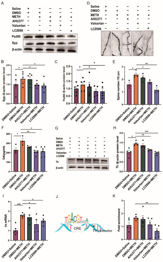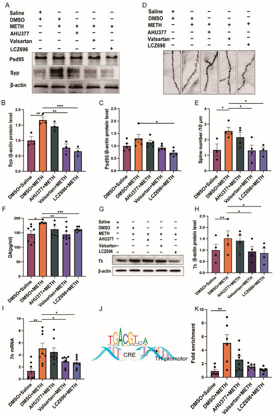 One-way ANOVA showed that treatment had no significant main effect on Th protein expression (F(4,15) = 1.346, p > 0.05). Paired t test indicated that the DMSO + METH group exhibited significantly higher Th protein levels compared to the DMSO + saline, valsartan + METH, and LCZ696 + METH groups (DMSO + saline: p < 0.01; valsartan + METH: p < 0.05; LCZ696 + METH: p < 0.05). No significant difference in Th protein expression was observed between the DMSO + METH and AHU377 + METH groups (p > 0.05; Figure 4G,H). The Kruskal–Wallis test revealed a significant main effect of treatment on Th mRNA expression (H = 16.2585, p < 0.01). The result showed that Th mRNA levels in the DMSO + METH group were significantly higher than those in the DMSO + saline, valsartan + METH, and LCZ696 + METH groups (DMSO + saline: p < 0.01; valsartan + METH: p < 0.05; LCZ696 + METH: p < 0.05). There was no significant difference in Th mRNA expression between the DMSO + METH and AHU377 + METH groups (p > 0.05; Figure 4I). The Kruskal–Wallis test revealed a significant main effect of treatment on Creb enrichment at the Th gene promoter across all groups (H = 11.345, p < 0.05). Post hoc analysis indicated that Creb enrichment in the DMSO + METH group was significantly higher than in the DMSO + saline group (p < 0.01). There were no significant differences in Creb enrichment levels between the DMSO + METH group and the LCZ696 + METH group (p = 0.07), AHU377 + METH group, or valsartan + METH group (p > 0.05; Figure 4J,K).
