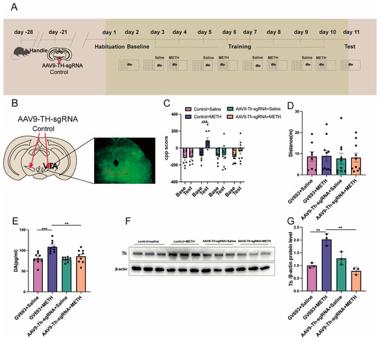The effect of Cre knockout in VTA Th promoter on METH-associated contextual memory acquisition. (A) The experimental timeline. (B) The expression of the virus in VTA. The red box indicates the region of viral injection in the VTA. (C) The effect of AAV9-Th sgRNA on CPP score in METH mice. (D) The locomotor distance of the spontaneous activity test in virus-injected mice. (E) The level of DA. (F) Representative Western blot bands of Th. (G) The protein level of Th in VTA. Group descriptions: GV693 = control viral vector; AAV9-Th-sgRNA = viral vector expressing sgRNA targeting the Th gene; saline = vehicle control; METH = methamphetamine exposure during CPP training or priming. ** p < 0.01, *** p < 0.001.