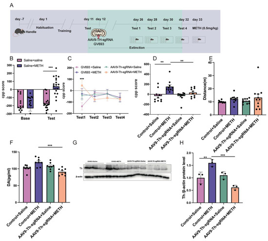 The effect of Cre-mediated knockout in the VTA Th promoter on METH-relapse in mice from the CPP acquisition phase. (A) The experimental timeline. (B) CPP score of METH-associated contextual memory acquisition mice. (C) The effect of AAV9-Th-sgRNA on CPP score in retrieval test mice. (D) The effect of AAV9-Th sgRNA on METH-induced robust relapse in METH CPP acquisition mice. (E) The locomotor distance of the spontaneous activity test in virus-injected mice. (F) The level of DA. (G) Representative Western blot bands of Th. (H) The protein level of Th in VTA. ** p < 0.01, *** p < 0.001.