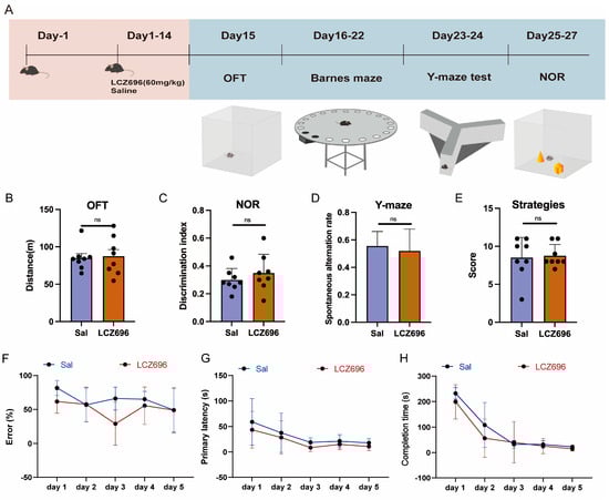 The effects of LCZ696 on mice behavior and cognition. (A) The experimental timeline. (B) OFT scores in the LCZ696 group and the saline group. (C) NOR scores in the LCZ696 group and the saline group. (D) Y-maze scores in the LCZ696 group and the saline group. (E–H) The strategies’ scores, error rate, primary latency, and completion time for the Barnes’ maze. ns: p > 0.05.