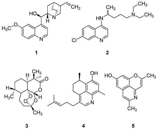 Rational therapy of malaria is one of the outstanding topics in history of medicine, since already in the 17th century the antimalarial activity of the extracts of bark of the Cinchona trees was discovered in South America and this drug was brought to Europe in the same century. In 1820, Pelletier isolated quinine (1) as the active principle, and the elucidation of quinine’s structure in 1911 can be regarded as the starting point of a rational development of antimalarials by means of organic synthesis. One of the first hallmarks in this regard was the synthesis of chloroquine (2) by Andersag in 1934. Chloroquine is an antimalarial drug that works by accumulating in the acidic food vacuole of malaria parasites, where it inhibits heme detoxification, leading to parasite death. However, increasing resistance has emerged due to mutations in the pfcrt (Plasmodium falciparum chloroquine resistance transporter) gene. These mutations lead to an altered transporter protein of the food vacuole membrane, resulting in enhanced drug efflux, which in consequence impairs the effectiveness of chloroquine [4,5,6]. As a result, chloroquine is no longer recommended as a first-line treatment in many malaria-endemic regions, prompting the need for alternative therapies.