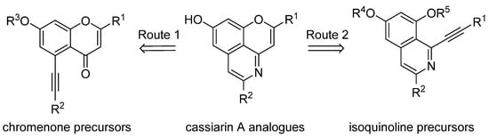 In order to obtain a diverse collection of cassiarin A analogs by total synthesis, we utilized and optimized two established approaches to the backbone of the alkaloid. In Route 1 (Figure 2) we started, inspired by the work of Yao [23] and Morita [24] from substituted chromenones, which were cyclized to the target pyrano[2,3,4-ij]isoquinolines via 5-alkynylchromenones under insertion of ammonia. Route 2, inspired by the work of the Honda [22] and Vaquero groups [25] in this field, included cyclization of alkynes as well, but utilized 8-oxygenated isoquinoline intermediates. In both cases, the residue replacing the respective methyl group of cassiarin A (5) was to be introduced by readily available terminal alkynes via a Sonogashira coupling, a reaction which has meanwhile found broad application in natural products synthesis [26].