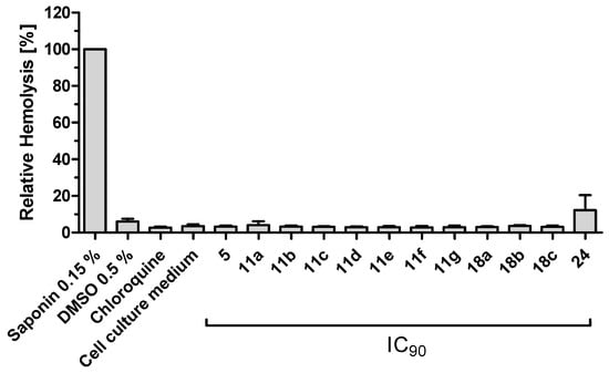 Cassiarin A (5) and analogs were subjected to cell toxicity assays. First, we tested potential hemolytic effects of the 12 compounds using the hemolysis assay (Figure 3). The solvent dimethyl sulfoxide (DMSO; at 0.5% v/v), chloroquine (at IC90 concentration) and culture media served as negative controls, the detergent saponin (at 0.15%) served as positive control in the assays. Human erythrocytes were adjusted to a hematocrit of 5% and incubated with each compound at IC90 concentration. After a 48 h incubation period, hemoglobin levels in the supernatant were measured spectrophotometrically and compared to controls. No increase in hemoglobin levels was observed for most of the compounds, except for 24. Noteworthy, for 24, a concentration of 100 µM was used, as no IC50 nor IC90 values could be determined in the Malstat assay.