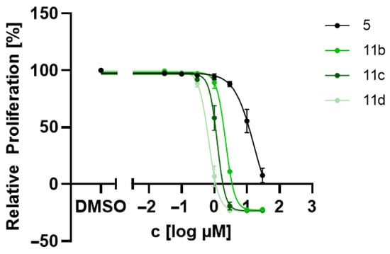 Further, we selected four compounds, cassiarin A (5), 11b, 11c and 11d, for testing on the human epithelial cell line HUVEC (human umbilical vein endothelial cells) to assess potential cytotoxicity. Unfortunately, the obtained IC50 values (16.4 µM for 5, 2.22 µM for 11b, 1.23 µM for 11c, 0.68 µM for 11d) were in the same concentration range (11b, 11d) or only factor 2 (cassiarin A) or factor 3 (11c) higher than the IC50 values of these compounds against P. falciparum 3D7 cells, indicating significant cytotoxicity at the respective IC50 concentrations (Figure 4). In contrast, for chloroquine, a selectivity index (=IC50 (HUVEC)/IC50 (3D7)) of 1987 has been reported [32]. Hence, despite enhanced anti-malarial activity, the potential therapeutic window is too small for further development of this compound class as drug candidates.