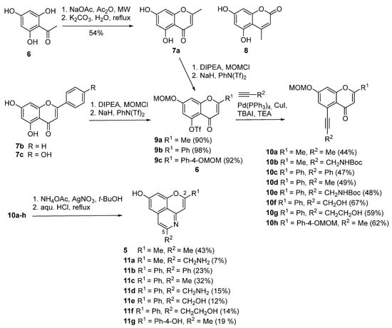 The dihydroxychromenones 7a–c were protected regioselectively at 7-OH with MOM chloride/DIPEA, followed by triflation at 5-OH with N-phenyl-bis(trifluoromethanesulfonimide)/NaH following Morita’s protocol [24] to give the triflate intermediates 9a–c in excellent yields. Subsequent Sonogashira coupling with five different terminal alkynes (containing methyl, phenyl, hydroxymethyl, 2-hydroxyethyl and Boc-protected aminomethyl residues) provided alkynylchromenes 10a–h in yields ranging from 44% to 67%. For the final cyclization step generating the pyridine subunit of the target compounds we worked out a novel, shorter protocol. In a previous study, Yao and Yao [23] first generated and isolated isochromenylium salt intermediates, which then were cyclized with ammonia, whereas Morita [24] first converted the propynyl residue into an acetonyl group and then cyclized with an ammonium salt. Inspired by work of Reddy et al. [28] we worked out a one-pot procedure for cyclization and MOM deprotection to yield the target compounds cassiarin A (5) and 11a–g. For the synthesis of cassiarin A (5), alkyne intermediate 10a was treated under Reddy’s conditions (AgNO3, ammonium acetate, tert-butanol) for cyclization. The crude fluorescent product was separated from the inorganic components by extraction with dichloromethane/2-propanol (4:1) and after evaporation, the MOM deprotection was performed with the crude intermediate using hydrochloric acid/methanol. Without this separation step, the yield dropped drastically. Alkaloid cassiarin A (5) was obtained in 43% yield over both steps. The analogs 11a–g were obtained in the same manner, albeit the yields were in most cases significantly lower.