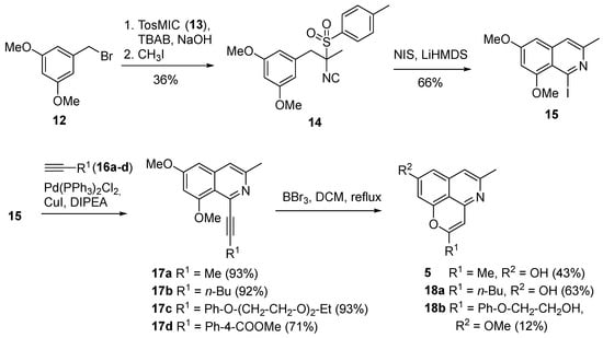 In Route 1 the substituent at the pyran ring was introduced at a very early stage. Thus, we worked out a complementary approach to cassiarin A analogs with modifications of the methyl residue at the pyran ring which allows a late-stage introduction of diverse substituents at C-2 (Figure 2, Route 2). For this purpose, 3-methylisoquinoline intermediates bearing a leaving group (iodo, triflate) at C-1 were required. The required 1-iodoisoquinolines can be prepared starting from TosMIC (van Leusen reagent, 13) and benzyl halides. Following this concept, the Vaquero group [25] developed a total synthesis of cassiarin A (5) utilizing 3,5-bis(methoxymethoxy)benzyl bromide. We found that this benzyl bromide is laborious to prepare and very unstable. Therefore, we decided to use less sensitive protective groups for the phenolic groups and ended up with cheap 3,5-dimethoxybenzyl bromide (12) (Scheme 2). Following Vaquero’s strategy, TosMIC (13) was deprotonated under phase-transfer conditions and successively alkylated with 12 and with iodomethane to give isonitrile 14 in 36% yield. Iodocyclization using N-iodosuccinimide and LiHMDS as a base yielded the desired 1-iodoisoquinoline 15 in 66% yield. Subsequent Sonogashira couplings with propyne (for the synthesis of cassiarin A (5)), 1-hexyne and 4-substituted phenylacetylenes 16d and 16c (prepared from 4-iodophenol by etherification and Sonogashira coupling [29]) gave the 1-alkynylisoquinolines 17a–d in high yields. Cyclization to the tricyclic target compounds could not be performed under Vaquero’s conditions (hydrochloric acid) [25] due to the higher stability of the methoxy protective groups compared to the MOM group. Fortunately, treatment of intermediates 17a and 17b with BBr3 in refluxing dichloromethane gave the target compounds cassiarin A (5) and 18a in 43% and 63% yields. To our surprise, arylacetylene 17c gave a cyclized product 18b in only 12% yield, in which one methoxy group was untouched, and part of the diethyleneglycol ether side chain was cleaved off. As an alternative O-demethylation reagent, we examined L-Selectride [30], but again, the only identifiable product was compound 18b, and the yield was even lower (5%). Benzoic ester 17d gave only a complex mixture of unidentified products under the cyclization conditions with BBr3, and the desired product 18c (see Scheme 3) could not be detected.