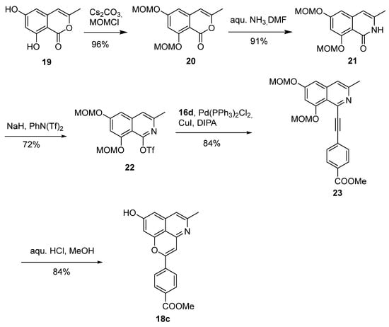 MOM protection of the phenolic groups of 19, followed by conversion of the resulting coumarine 20 into isoquinolone 21 and triflation according to Honda’s protocol gave isoquinoline triflate 22 in 63% yield over 3 steps. Sonogashira coupling of triflate 22 with phenylacetylene 16d proceeded well (84% yield), and to our pleasure subsequent simultaneous MOM deprotection and cyclization mediated by treatment with hydrochloric acid provided the previously unavailable (see Route 2) target compound 18c in 84% yield (Scheme 3).