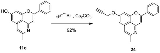 Finally, a propargyl ether analog 24 was prepared by high-yielding etherification of the phenolic group of 11c. This compound was designed as a potential “clickable” cassiarin A analog, in case that etherification would not eliminate antiplasmodial activity (Scheme 4).