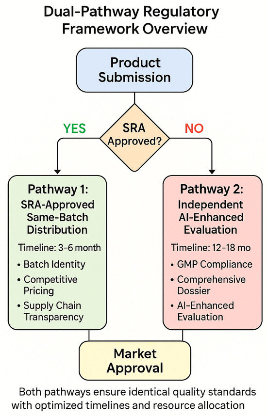 Dual-pathway framework overview—a flow diagram illustrating the decision tree for product categorization into Pathway 1 (SRA-approved, same-batch distribution) versus Pathway 2 (independent AI-enhanced evaluation), showing the verification requirements and approval timelines for each pathway. Framework design based on [31,32,33,34].