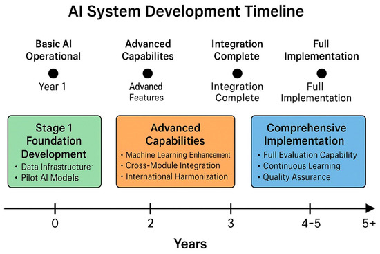 The foundation stage focuses on establishing the basic infrastructure and capabilities necessary for AI-enhanced regulatory review [86,87]. Data infrastructure creation involves digitizing historical regulatory submissions and decisions, developing standardized data formats that enable AI processing, and creating comprehensive regulatory knowledge databases that serve as the foundation for machine learning algorithms [88,89]. Recent implementations demonstrate that this stage requires substantial investment in data standardization and quality assurance but provides immediate benefits through improved document management and searchability, with efficiency gains of 30–40% [90].