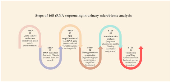The standard workflow of 16S rRNA sequencing comprises several key steps: urine collection (via midstream, catheterization, or suprapubic aspiration), bacterial DNA extraction, PCR amplification of the 16S gene, high-throughput sequencing, followed by bioinformatics analysis and taxonomic profiling (Figure 1). This workflow allows researchers to map microbial diversity and abundance with relatively high resolution [65,66].
