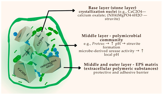 Moreover, the intricate crosstalk between the urinary microbiome, host metabolic pathways, and immune surveillance mechanisms constitutes a multifactorial network that extends beyond lithogenesis to encompass broader urological and systemic pathophysiological states. Biofilm-forming bacteria such as Proteus mirabilis and Klebsiella pneumoniae can serve as nucleation sites by anchoring mineral crystals within their extracellular polymeric matrix, thereby facilitating stone maturation and persistence. Concurrently, microbial metabolites—including ammonia, oxalate, and lipopolysaccharides—modulate urinary pH, oxidative stress, and epithelial barrier integrity, all of which are critical determinants of crystal aggregation, retention, and inflammation-mediated tissue remodeling [5,6].