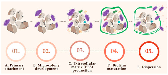 Biofilm formation on the nucleus of a urinary stone; (A)—primary attachment (bacteria adhere to stone surface via pili, adhesis, and proteins; organic film and urinary proteins enhance attachment); (B)—microcolony development (bacteria multiply and form early clusters controlled by urine pH, nutrient availability, and quorum sensing); (C)—extracellular matrix production (bacteria secrete extracellular polymeric substances (EPSs), which contain polysaccharides, proteins, and DNA that protect the biofilm); (D)—biofilm maturation (development of 3D architecture with nutrient channels); (E)—dispersion (bacteria detach due to stress (e.g., pH, nutrient depletion) leading to infection spread and new biofilm formation).