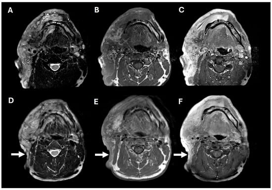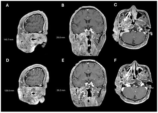 Pre- and post-operative brain MRIs. Pre-operative T2, T1, and T1+contrast imaging (A–C), showing a large, T2-hyperintense, enhancing, predominantly right facial mass. Post-operative T2, T1, and T1+contrast imaging (D–F), showing posterior tumor debulking (arrows).