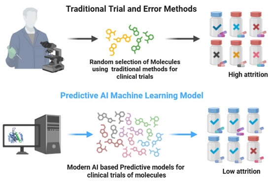 Traditional trial and error vs. modern AI-based discovery approaches (biorender.com, accessed on 28 April 2025). Traditional drug discovery is time-consuming, costly, and has low success rates, whereas the AI-based methods are most effective in the identification of novel drug targets using patients’ genomic data, thus being highly cost-effective with a high success rate.