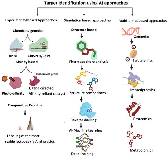 Approaches to the identification of drug targets (biorender.com, accessed on 28 April 2025). The figure summarizes the role of various approaches, including experimental approaches, omics approaches, and molecular simulation-based approaches for the identification of new drug targets.