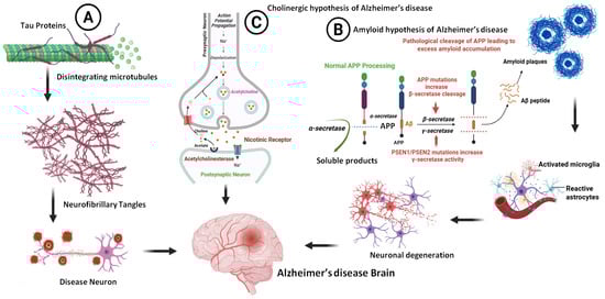 Pathological aspects of AD (A), the formation of NFTS, (B), the formation of Aβ, and (C) the cholinergic hypothesis and role of cholinesterase inhibitors (biorender.com, accessed on 28 April 2025).