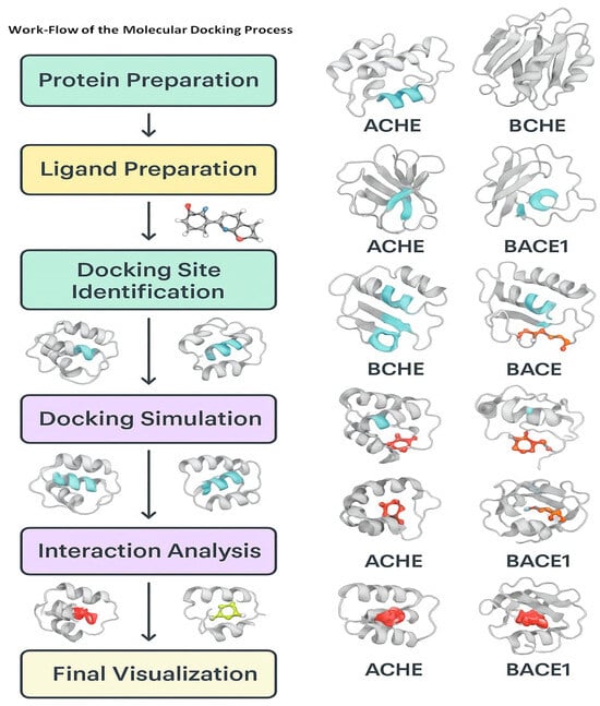 Workflow of the simulation-based analysis of the potential molecules against the enzyme targets of AD (images were generated using MOE (Moe2018) docking software).