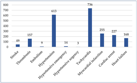 A total of 10 Standardized MedDRA Queries (SMQ) associated with cardiovascular disorders were selected. High numbers of cases were related to tachycardia (n = 736, 1.25%), hypertension (n = 613, 1.04%), myocardial infarction (n = 255, 0.43%), cardiac arrest (n = 227, 0.39%), heart failure (n = 168, 0.29%), and thrombosis (n = 157, 0.27%). The blood pressure was severely elevated (≥180/120 mmHg) in seventeen (0.03%) cases, out of which only three didn’t present clinical signs of acute target organ damage (hypertensive urgency). The number of cases reported for stroke, another medical emergency, was 49 (0.08%) (Figure 4).
