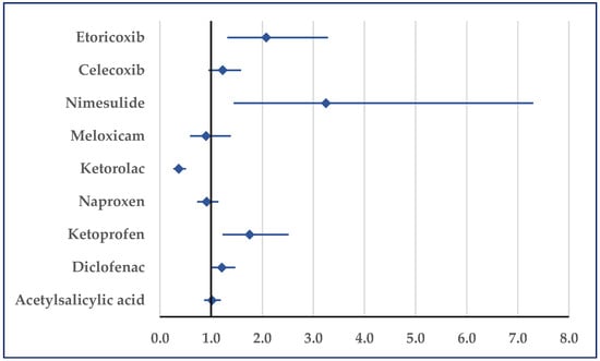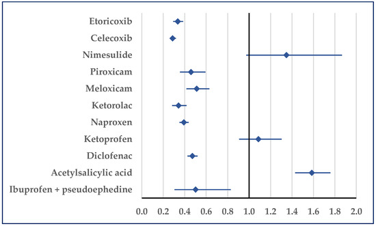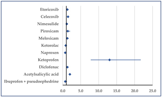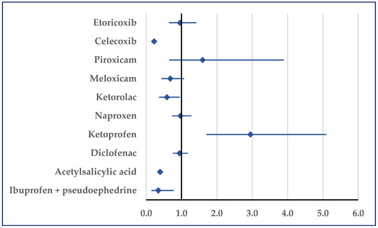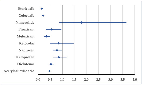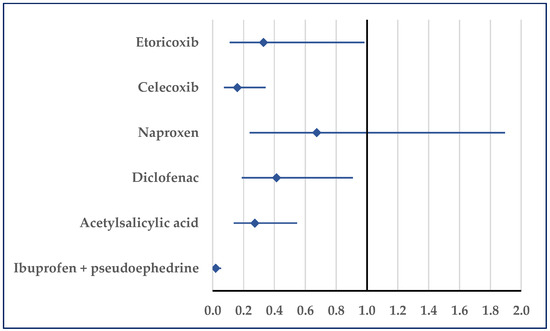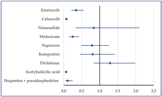 Figure 7 presents the probability of reporting embolism. Thus, a disproportionate number of reports was noticed in comparison to etoricoxib (ROR: 0.33; 95% CI: 0.11–0.98), celecoxib (ROR: 0.16; 95% CI: 0.07–0.34), diclofenac (ROR: 0.41; 95% CI: 0.19–0.91), acetylsalicylic acid (ROR: 0.27; 95% CI: 0.14–0.55), and ibuprofen/pseudoephedrine (ROR: 0.02; 95% CI: 0.01–0.06) (Figure 7).
