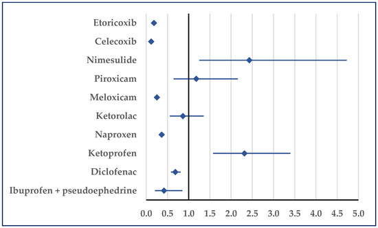 Stroke was reported for ibuprofen with a lower probability compared with etoricoxib (reporting odds ratio (ROR): 0.34; 95% confidence interval (CI): 0.21–0.55), celecoxib (ROR: 0.07; 95% CI: 0.06–0.10), meloxicam (ROR: 0.25; 95% CI: 0.14–0.43), acetylsalicylic acid (ROR: 0.07; 95% CI: 0.05–0.09), and ibuprofen/pseudoephedrine (ROR: 0.11; 95% CI: 0.05–0.25) (Figure 5, Table S1). No statistically significant differences were observed in comparisons to the other selected NSAIDs.