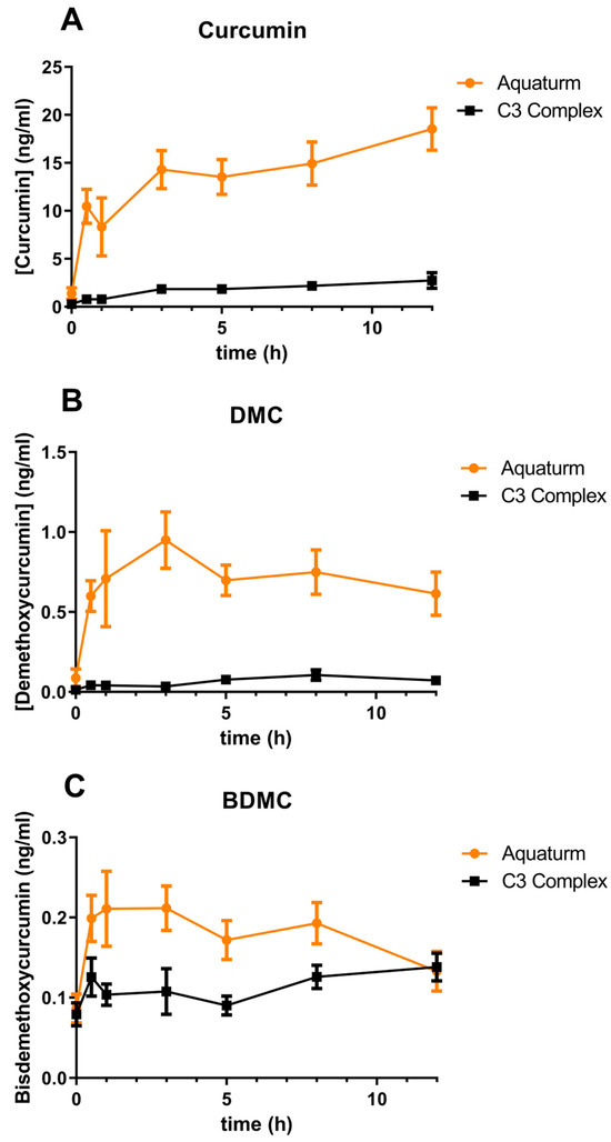Previous pharmacokinetic studies have demonstrated similar plasma concentrations of curcumin, DMC, and BDMC when control curcumin was used, validating our method and results. Purpura et al. (in 2018) used an 1800 mg dose of control curcumin, measuring total curcuminoid plasma concentrations of ~2 ng/mL of curcumin, DMC and BDMC [15]. Furthermore, Jäger et al. (in 2014) used an 1800 mg dose of control curcumin, measuring plasma concentrations of ~2 ng/mL of total curcuminoids [19].