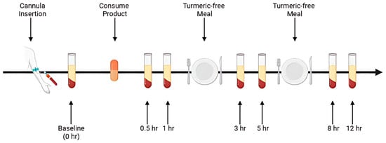 The study began with administration of the AQUATURM® formulation, followed by a 7-day washout period. The Control Curcumin Supplement® tablet was then administered using the same 12 h procedure. Upon arrival at the clinic, a cannula was inserted, and a baseline blood sample was collected prior to curcumin ingestion. Following ingestion, blood samples were collected at six time points over a 12 h period. Participants received a turmeric-free meal after the 1 h and 5 h blood draws.