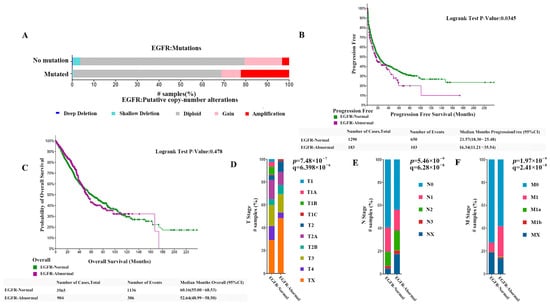 Among all non-small cell lung cancers, the number of samples/cases with normal EGFR was 6006/5997, the number of samples/cases with abnormal EGFR was 1570/1425, and 83 cases had crossover and were not counted in the analysis. Molecular profiles include mutations, structural variants (SV), and copy number alterations (abbreviated CNV). Among them, the number of samples/cases with EGFR mutations was 1378 (18%)/1222 (17%), the number of samples/cases with significant EGFR copy number abnormalities (amplified + homo-deleted) was 484 (6%)/461 (6%), and the number of samples/cases with structural variants was 11 (<1%)/11 (<1%). The proportion of patients with copy number amplified was significantly increased in patients with EGFR mutations, as shown in Figure 1A. In our prognostic analysis of data from patients with normal and abnormal EGFR, progression-free survival was significantly better in patients with normal EGFR than in patients with abnormal EGFR. The median progression-free survival (95% CI) of 21.57 (18.30–25.48) months in the normal EGFR group was much higher than the median progression-free survival of 16.34 (11.21–35.54) months in patients with abnormal EGFR (p < 0.05), as Figure 1B shows. However, the analysis of overall survival showed no significant difference between the two groups, as shown in Figure 1C. The analysis of tumor invasion and metastasis in both groups showed that the proportion of patients with the EGFR-abnormal type had a significantly lower percentage in TI stage, N0 stage, and M0 stage than those with the EGFR-normal type, as shown in Figure 1D–F. This indicates the current clinical status of NSCLC is thatcompared with patients with normal EGFR, those with EGFR abnormalities exhibit more rapid disease progression, a greater likelihood of tumor cell invasion, and significantly more severe metastasis.