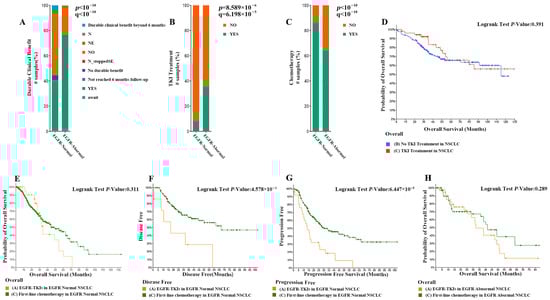 (A) Comparison of the proportion of patients with EGFR abnormalities and patients with normal EGFR with sustained clinical benefit (73.06% vs. 39.04%). (B) A total of 64.64% of patients with EGFR abnormalities underwent chemotherapy and 35.9% underwent TKI therapy. (C) A total of 86.44% of patients with normal EGFR underwent chemotherapy and 8.6% underwent TKI therapy. (D) The survival curves of NSCLC patients treated with TKI or not. (E) The survival curves of NSCLC patients with normal EGFR treated with TKI or not. (F,G) Comparison of disease-free survival and progression-free survival in patients treated with first-line chemotherapy versus EGFR-TKI therapy. (H) Overall survival curves comparing EGFR-TKI-treated patients with first-line chemotherapy in NSCLC patients with EGFR abnormalities.