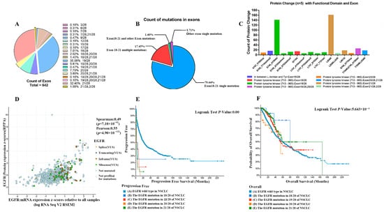 (A) Major distribution of mutations in EGFR exons in non-small cell lung cancer patients. (B) Gene mutation statistics. (C) The mutations of EGFR in exons 18, 19, 20, and 21 were all in the structural domain of tyrosine kinase. (D) Protein expression. (E) NSCLC patients with exon 18, 19, 20, and 21 mutations have significantly lower progression-free survival than EGFR-wild-type patients. (F) NSCLC patients with exon 18, 19, 20, and 21 mutations have significantly higher overall survival than wild-type patients at 50 months post-survival.