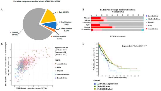 (A) The percentage of EGFR gene copy number deletion was 2.87%. (B) Analysis of EGFR mutations shows that EGFR gene copy number amplification was more likely to occur in EGFR mutant NSCLC. (C) The increase in gene copy number was positively correlated with the expression of EGFR. (D) Median months overall (95% CI) was 58.27 (52.64–73.16) for EGFR diploid patients, 46.81 (37.96–64.97) for EGFR gain patients, and 40.37 (35.10–51.30) for EGFR amplification patients.