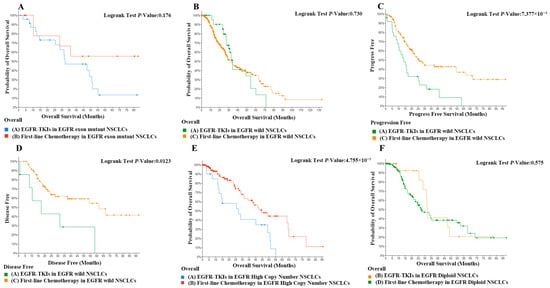 (A) Comparison of overall survival in first-line chemotherapy in EGFR-exon-mutant NSCLCs with EGFR-TKIs in EGFR-exon-mutant NSCLCs. (B) Comparison of overall survival in first-line chemotherapy in EGFR-exon-mutant NSCLCs with EGFR-TKIs in EGFR-wild NSCLCs. (C) Comparison of progression-free survival in first-line chemotherapy in EGFR-wild NSCLCs with EGFR-TKIs in EGFR-wild NSCLCs. p < 0.01. (D) Comparison of disease-free survival in first-line chemotherapy in EGFR-exon-mutant NSCLCs with EGFR-TKIs in EGFR-wild NSCLCs. p < 0.05. (E) Comparison of overall survival in first-line chemotherapy in EGFR-high-copy-number NSCLCs with EGFR-TKIs in EGFR-copy-number NSCLCs. p < 0.05. (F) Comparison of overall survival in first-line chemotherapy in EGFR-diploid NSCLCs with EGFR-TKIs in EGFR-diploid NSCLCs.