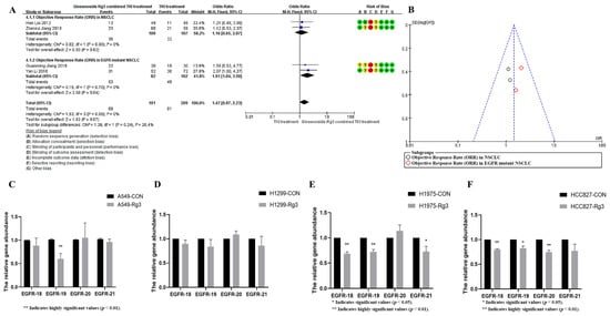 (A) Ginsenoside Rg3 could increase the objective remission rate of TKI-treated patients up to 1.9-fold in EGFR mutant patients (p < 0.05). The data is sourced from: Hao Liu (2012) [27], Zhenrui Jiang (2018) [28], Guanming Jiang (2019) [29], Yan Li (2016) [30]. (B) The distribution of studies in the funnel plot was approximately symmetrical. (C) Ginsenoside Rg3 significantly down-regulates EGFR exon 19 in the EGFR-wild-type A549 cell line (p < 0.05). (D) Ginsenoside Rg3 had no effect on EGFR copy number in the EGFR-wild-type H1299 cell line. (E) Ginsenoside Rg3 significantly down-regulated the copy number of exons 18, 19, and 21 of EGFR in H1975 cells (p < 0.05). (F) Ginsenoside Rg3 significantly down-regulated the copy number of exons 18, 19, and 20 of EGFR in HCC827 cells (p < 0.05).