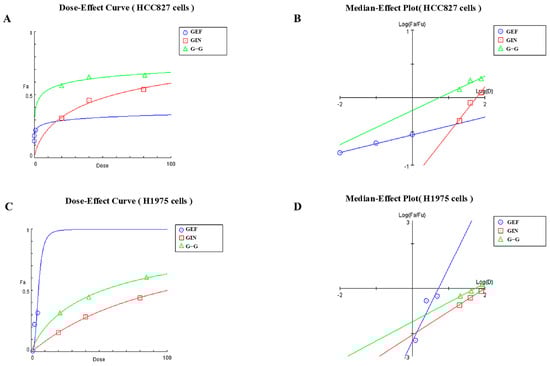 (A) Dose–Effect Curve for the HCC827 Cell Line. Blue circles represent the effects of GEF (Gefitinib) alone. Red squares represent the effects of GIN (Ginsenoside Rg3) alone. Green triangles represent the combined effects of GEF and GIN at a 1:1 volume ratio. (B) Median–Effect Plot for the HCC827 Cell Line. Blue circles represent the effects of GEF (Gefitinib) alone. Red squares represent the effects of GIN (Ginsenoside Rg3) alone. Green triangles represent the combined effects of GEF and GIN at a 1:1 volume ratio. (C) Dose–Effect Curve for the H1975 Cell Line. Blue circles represent the effects of GEF (Gefitinib) alone. Red squares represent the effects of GIN (Ginsenoside Rg3) alone. Green triangles represent the combined effects of GEF and GIN at a 1:1 volume ratio. (D) Median–Effect Plot for the H1975 Cell Line. Blue circles represent the effects of GEF (Gefitinib) alone. Red squares represent the effects of GIN (Ginsenoside Rg3) alone. Green triangles represent the combined effects of GEF and GIN at a 1:1 volume ratio.