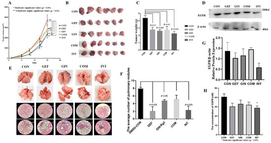 Healthy SPF-grade Balb/c male mice (SPF (Beijing) Biotechnology Co., Ltd., Beijing, China, License No.: SYXK (JING) 2023-0011) were used for the experiments at 6–8 weeks of age, with a body mass of 18–22 g, 12 h/d of light exposure, and unlimited water intake. All animal experiments were approved by the Animal Care and Experimental Committee of Beijing University of Chinese Medicine (No. BUCM-2024062805-2218). The primary tumor model was established using the same method that was reported by Tianhau Liu et al. [46]. A mouse lung cancer model was established by inducing with urethane (0.8 mg/g body weight) dissolved in 0.9% NaCl (saline) twice a week at intervals of 72 h for 5 weeks. For the mouse tumor loading expt, 1 × 106 LLC cells in 100 µL PBS were injected subcutaneously into the right flank of Balb/c mice. Mice were randomly divided into five groups: (1) GIN group received 3 mg/kg ginsenoside Rg3; (2) GEF group received 45 mg/kg gefitinib; (3) CON group received an equal volume of solvent (normal saline with 0.7% DMSO); (4) COM group received 3 mg/kg ginsenoside Rg3 and 45 mg/kg gefitinib; (5) INT group received 3 mg/kg ginsenoside Rg3 or 45 mg/kg gefitinib at sequential intervals. At the end of the experiments, all mice were humanely killed, and lung tissues were photographed and preserved. For the urethane-modeled mice, we counted and enumerated all surface nodules in the upper and lower lobes visible to the naked eye after autopsy (Nodule morphology: white transparent protuberance, hard texture) and reexamined them after fixation in paraformaldehyde. For the Lewis lung carcinoma-bearing mice, during the administration period, tumor volume was measured by a vernier caliper every 2 days. The tumor volume was calculated as follows: tumor volume (mm3) = length × width2 × 0.5.