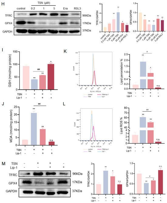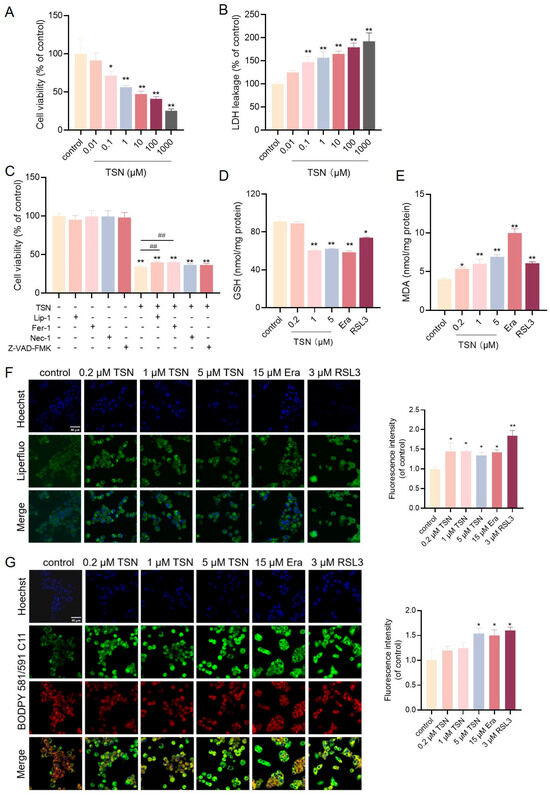 HepG2 cells were treated with TSN for 48 h to assess TSN’s cellular toxicity. As shown in Figure 1A, TSN reduced the cell viability in a concentration-dependent manner with an estimated IC50 value of 8.3 µM. Figure 1B shows that TSN exposure elevated LDH leakage. HepG2 cells were treated with TSN only or TSN combined with different cell death inhibitors, such as the ferroptosis inhibitors Lip-1 and Fer-1, the necroptosis inhibitor Nec-1, and the apoptosis inhibitor Z-VAD-FMK. The CCK-8 results showed that only Lip-1 and Fer-1 prevented TSN-induced cell death (Figure 1C). The ferroptosis inducers RSL3 and Era and the ferroptosis inhibitor Lip-1 were used as experimental interventions. GSH serves as an important regulator of intracellular redox homeostasis. The GSH level was significantly reduced after incubation with TSN, RSL3, or Era (Figure 1D), whereas the ferroptosis inhibitor Lip-1 reversed the TSN-induced reduction in GSH (Figure 1I). Lipid peroxidation was evaluated with the fluorescent probes BODIPY 581/591 C11 and Liperfluo, and by measuring the malondialdehyde (MDA) concentrations. These studies showed that the TSN, RSL3, and Era groups significantly induced lipid peroxidation (Figure 1E–G), which was effectively mitigated by co-treatment with Lip-1 (Figure 1J–L). Ferroptosis-related proteins were determined by Western blotting after treatment with TSN or the ferroptosis inducers RSL3 and erastin (Era). Decreased GPX4 and increased TFRC levels were observed, suggesting TSN-induced ferroptosis activation (Figure 1H) and a protective effect of ferroptosis inhibitor Lip-1 against TSN (Figure 1M). Together, these data support the idea that TSN promoted ferroptosis with lipid peroxidation, thereby inducing hepatotoxicity.