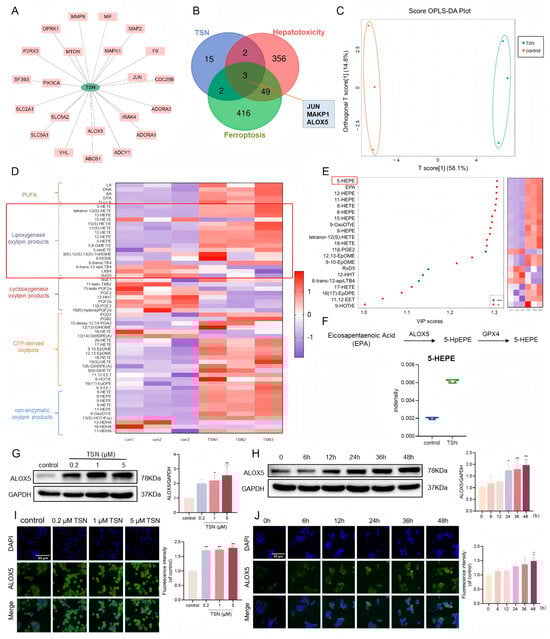TSN promotes the expression of ALOX5 and its downstream metabolites in vitro. (A) The compound–target network for TSN. The pink node represents the targets. (B) A Venn graph of genes in TSN, ferroptosis, and hepatotoxicity. (C–F) HepG2 cells were treated with TSN (5 μM) for 48 h (n = 3). (C) Orthogonal partial least-squares discriminant analysis (OPLS–DA) score plot. There was a clear distinction between the control and TSN–treated groups. (D) Heatmap showing the expression of metabolites involved in the polyunsaturated fatty acid (PUFA) metabolism pathway. The red box shows the levels of LOX metabolites. (E) Important volatiles (VIP > 1.0) identified by OPLS–DA. The heatmap (right) indicates the relative concentration of the corresponding metabolite in the respective groups. The red box shows the metabolite with the highest VIP values. (F) The content changes in 5–HEPE between different groups. (G,H) The protein level of ALOX5 was analyzed by Western blotting. (I,J) Immunofluorescence images of the ALOX5 protein level. Scale bar: 80 μm. The data are presented as the mean ± SD of three independent experiments. * p < 0.05 and ** p < 0.01 versus vehicle control.
