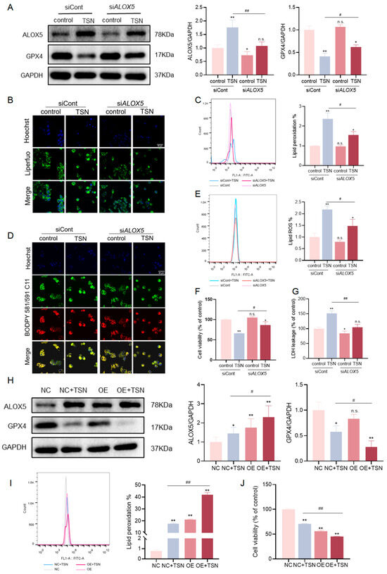 The level of ALOX5 affected the sensitivity of TSN-induced cell damage involving ferroptosis. (A–G) HepG2 cells were transfected with control or ALOX5 siRNA and cultured for 48 h before treatment with TSN (5 μM) for 48 h. (A) The protein levels of ALOX5 and GPX4 were analyzed by Western blotting. (B,C) The accumulation of lipid peroxide in HepG2 cells was detected with the Liperfluo probe, and then analyzed by confocal imaging and flow cytometry. Scale bar: 40 μm. (D,E) The accumulation of lipid ROS in HepG2 cells was detected with BODIPY 581/591 C11, and then analyzed by confocal imaging and flow cytometry. Scale bar: 40 μm. (F) The cell viability was determined by a CCK-8 assay. (G) LDH leakage was measured by an LDH assay kit. (H–J) HepG2 cells were transfected with a vector or ALOX5 plasmid for 48 h and then treated with TSN (5 μM) for 48 h. (H) The protein levels of ALOX5 and GPX4 were analyzed by Western blotting. (I) The accumulation of lipid peroxide in HepG2 cells was detected with the Liperfluo probe and analyzed by flow cytometry. (J) The cell viability was determined by a CCK-8 assay. The data are presented as the mean ± SD of three independent experiments. n.s. (not significant); * p < 0.05 and ** p < 0.01 versus vehicle control; # p < 0.05 and ## p < 0.01 versus TSN group.