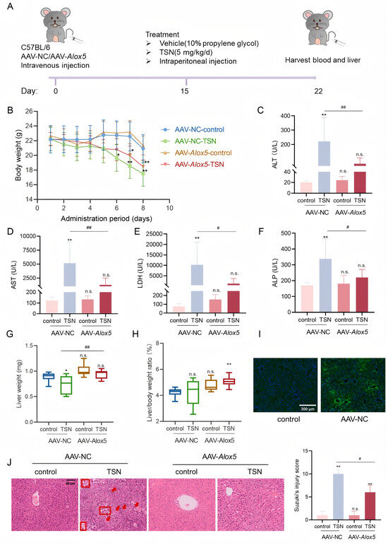 To investigate the role of ALOX5 in TSN-induced hepatic injury in vivo, C57BL/6 mice received an intravenous adeno-associated viral serotype 8 (AAV8)-mediated ALOX5 knockdown (Figure 5A). Following a 2-week stabilization period post-model establishment, the mice were intraperitoneally administered 5 mg/kg TSN or a vehicle for 7 days. After the TSN treatment, the mice exhibited fur discoloration, a decreased vitality, and body weight loss, with an attenuated weight reduction in the AAV-Alox5-TSN group versus the AAV-NC-TSN controls (Figure 5B). Liver function tests on the mice demonstrated that ALT, AST, LDH, and ALP were elevated in the TSN-treated mice and were significantly attenuated in the AAV-Alox5-TSN group (Figure 5C–F). Compared to the obvious liver weight decrease in AAV-NC-TSN mice, the AAV-Alox5-TSN group maintained a significantly higher hepatic mass (Figure 5G). However, while the liver-to-body-weight ratio showed no significant differences between the AAV-NC-TSN and AAV-Alox5-control groups compared to the AAV-NC-controls, the AAV-Alox5-TSN group exhibited a significantly elevated ratio (Figure 5H). An immunohistological analysis showed that large areas of AAV-transduced liver tissues were EGFP-positive (Figure 5I), indicating effective transduction. A histopathological analysis demonstrated that, in both control groups, the structure of the hepatic lobules was normal, the hepatocytes were orderly arranged around the central vein, and the hepatic sinusoids were well defined. In both TSN groups, a mussily arranged hepatic plate, hepatocellular swelling, and vacuolization were observed. Moreover, the AAV-NC-TSN group showed multiple areas of spotty necrosis (red arrows) and ballooning degeneration (red boxes). The AAV-Alox5-TSN group showed a clear hepatic sinusoid and partial swelling hepatocytes (Figure 5J). In comparison, the AAV-Alox5-TSN group had milder pathological damage.