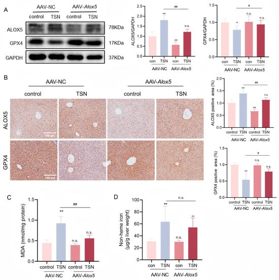 An ALOX5 knockdown protects against TSN-induced ferroptosis in vivo. (A) The expression levels of ALOX5 and GPX4 in liver tissues were analyzed by Western blotting. (B) Representative results of IHC staining for ALOX5 and GPX4. The percentage of positive area was analyzed using the Image J software (version 1.53t). Scale bar: 150 μm. (C) The level of MDA in liver tissues was detected using an MDA assay kit. (D) Non-heme iron was measured in liver tissues. The data are presented as the mean ± SD. n.s. (not significant); * p < 0.05 and ** p < 0.01 versus vehicle control; # p < 0.05 and ## p < 0.01 versus AAV-NC-TSN group; n = 6.
