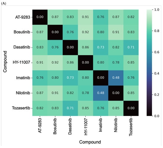 Cheminformatics analysis of BCR-ABL inhibitors. (A) Heatmap for the distance matrix using Tanimoto coefficients and Morgan fingerprints. (B) Heatmap for the distance matrix using Euclidean distances and 2D alvaDesc molecular descriptors. (C) Principal component analysis of seven BCR-ABL inhibitors using 2D alvaDesc molecular descriptors and Euclidean distances. The color gradient reflects DLS_cons—the consensus drug-likeness score—providing an additional interpretive layer grounded in the pharmacokinetic and physicochemical profile of the molecules. The plot reveals the principal component scores for PC1 (50.79%) and PC2 (19.12%), which together explain ~70% of the total variance, suggesting good dimensional reduction and data representation fidelity.