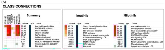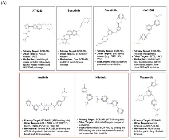 The CMap analysis revealed distinct transcriptional profiles among the seven BCR-ABL inhibitors (Figure 4A). Compounds such as dasatinib, bosutinib, tozasertib, and AT-9283 exhibited widespread positive and negative connections across multiple classes, compounds, and genes. A strong connectivity with unrelated perturbagen classes (e.g., aurora kinases, EGFR inhibitors, VEGFR inhibitors, PDGFR inhibitors, and HIV protease inhibitors), which are not directly tied to BCR-ABL signaling, indicated a broad polypharmacology and a reduced selectivity of inhibitors, consistent with their known multi-kinase activity.