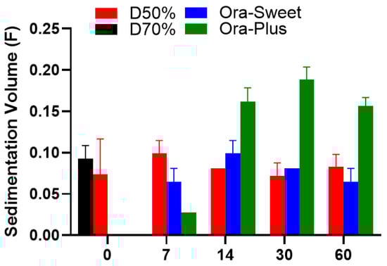 The viscosity (cP) of the four different furosemide suspensions at different storage periods is shown in Figure 3. All suspensions maintained a relatively consistent viscosity. The Ora-Sweet-based suspension had the highest viscosity throughout the study (65–70 cP), and the Dextrose 50% suspension had the lowest viscosity (2–5 cP). The rank order of viscosity was Ora-Sweet > Ora-Plus > Dextrose 70% > Dextrose 50%. A two-way ANOVA was conducted to assess the impact of formulation type and storage duration on sedimentation volume (F). The analysis revealed statistically significant effects for both the formulation (p < 0.0001) and time (p < 0.0001), as well as a highly significant interaction between the two factors (p < 0.0001).
