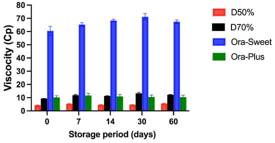The viscosity of the furosemide suspensions over 60 days at 4 °C (n = 3, mean ± standard deviation, p > 0.05).