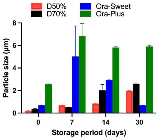 The particle size analysis revealed that the Dextrose 50% and Dextrose 70% suspensions showed initial stability but increased in particle size over time, indicating aggregation. In contrast, the Ora-Sweet formulation maintained a consistent particle size, while Ora-Plus exhibited a marked increase, suggesting a tendency toward sedimentation. These findings underscore the importance of vehicle selection in maintaining particle size consistency, which is crucial for ensuring uniform drug distribution and bioavailability. The zeta potential results further confirmed these observations: Ora-Plus demonstrated the most negative zeta potential values, indicating superior electrostatic repulsion and dispersion stability compared to the other formulations. This characteristic may contribute to the long-term stability of the Ora-Plus suspension, aligning with prior research that highlights the significance of zeta potential in suspension formulations [28].