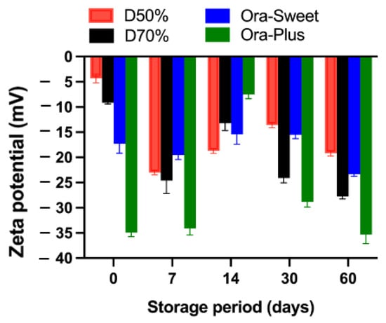 The zeta potential results for the different furosemide suspensions over the study period are presented in Figure 5. All suspensions had negative zeta potential values throughout the study period, with Dextrose 50% exhibiting the lowest negative zeta potential value initially (−4.32 mV), which became more negative over time, whereas Dextrose 70% maintained more negative values at different time points, suggesting better stability and a reduced tendency toward aggregation. Ora-Sweet had more consistent values and a higher degree of stability than the Dextrose-based suspensions. However, in comparison to all other compounded suspensions, Ora-Plus maintained the most negative values, starting at −34.9 mV and reaching −35.3 mV at the end of the study (day 60), suggesting higher electrostatic repulsion, greater particle dispersion, and superior stability compared with the other vehicle formulations.