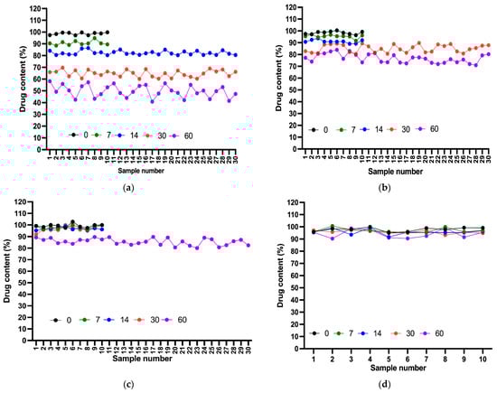 Drug content results for compounded suspensions over a 60-day storage period: (a) Dextrose 50%; (b) Dextrose 70%; (c) Ora-Sweet; (d) Ora-Plus.