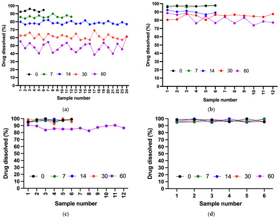 Dissolution profiles of compounded suspensions after 60 min over 60 days: (a) Dextrose 50%; (b) Dextrose 70%; (c) Ora-Sweet; (d) Ora-Plus.